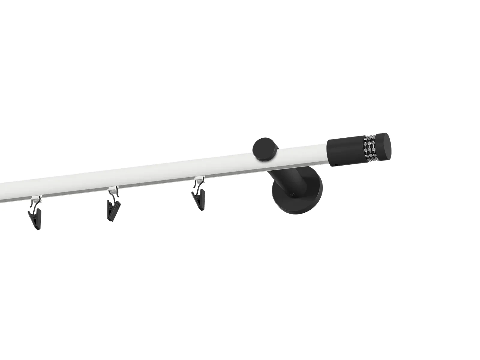 Jednoradová drážková garniža s povrchovou úpravou - bielo čierna lakovaná. Garniže sú dodávané sú v kompletoch. Tvar koncovky a typ držiaka podľa zadaného výberu.