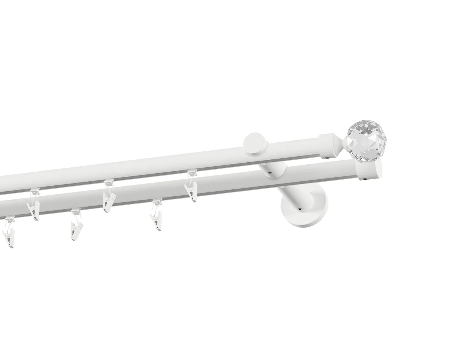 Dvojradová drážková garniža s povrchovou úpravou - biela lakovaná. Garniže sú dodávané sú v kompletoch. Tvar koncovky a typ držiaka podľa zadaného výberu.
