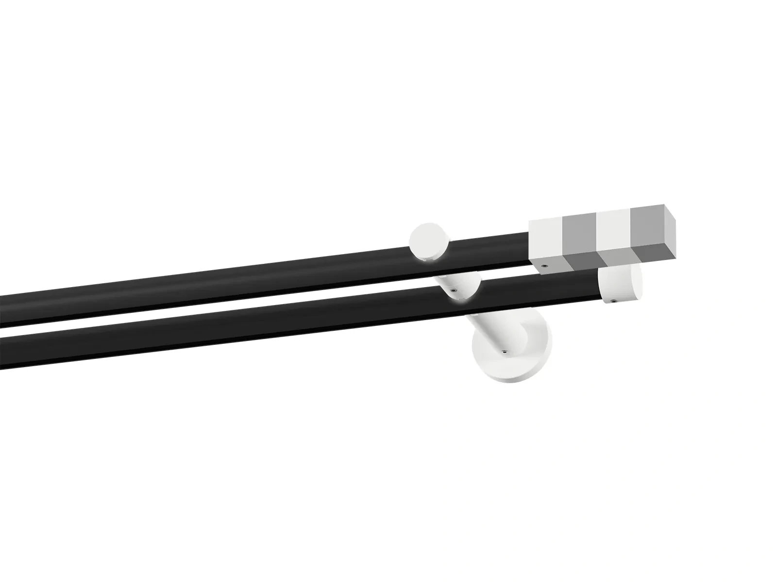 Dvojradová drážková garniža s povrchovou úpravou - čierno biela lakovaná. Garniže sú dodávané sú v kompletoch. Tvar koncovky a typ držiaka podľa zadaného výberu.