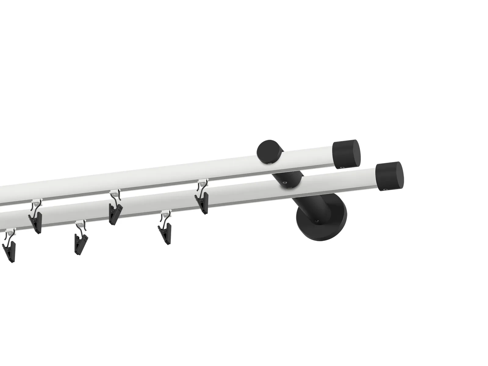 Dvojradová drážková garniža s povrchovou úpravou - bielo čierna lakovaná. Garniže sú dodávané sú v kompletoch. Tvar koncovky a typ držiaka podľa zadaného výberu.