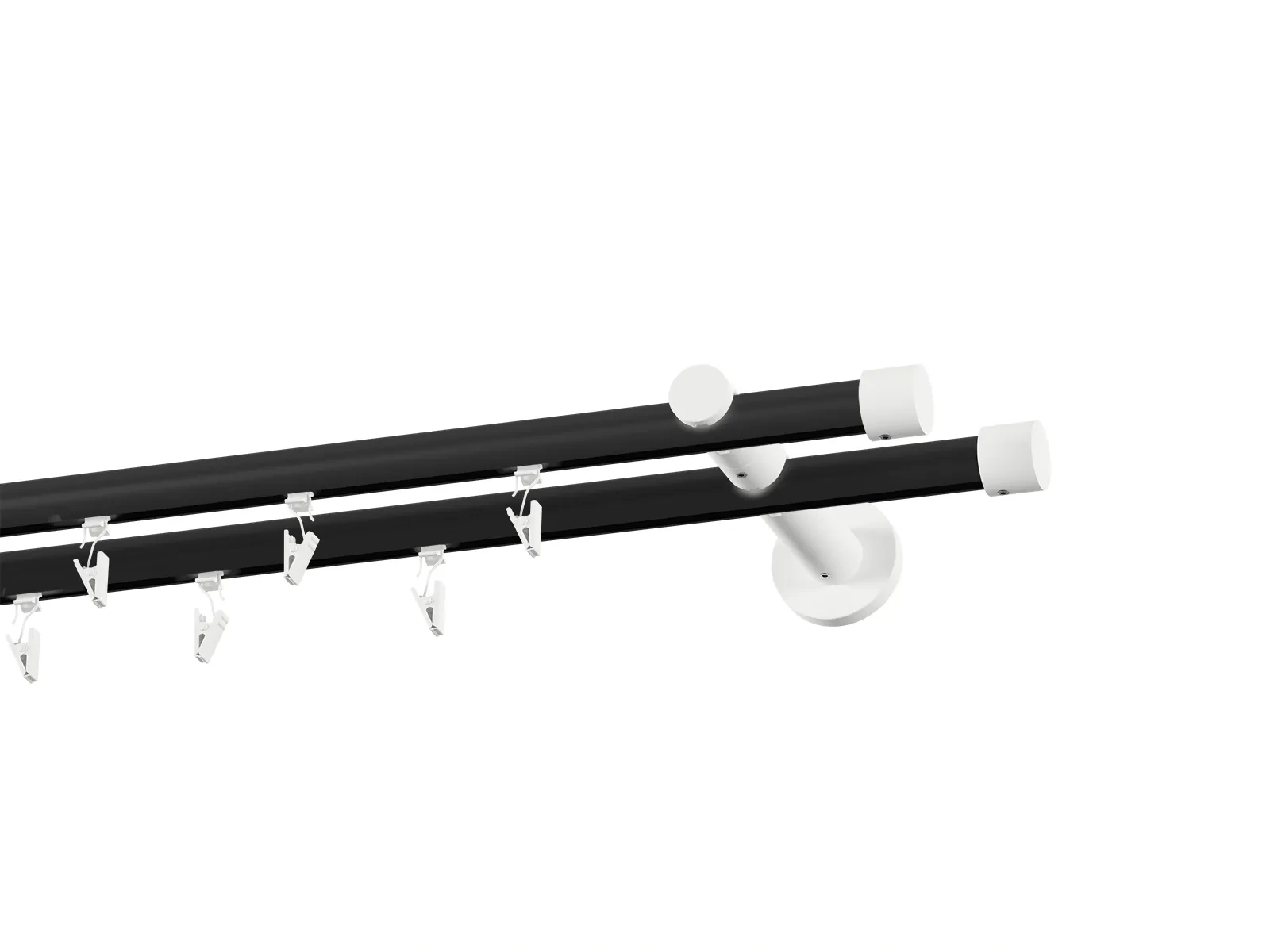Dvojradová drážková garniža s povrchovou úpravou - čierno biela lakovaná. Garniže sú dodávané sú v kompletoch. Tvar koncovky a typ držiaka podľa zadaného výberu.