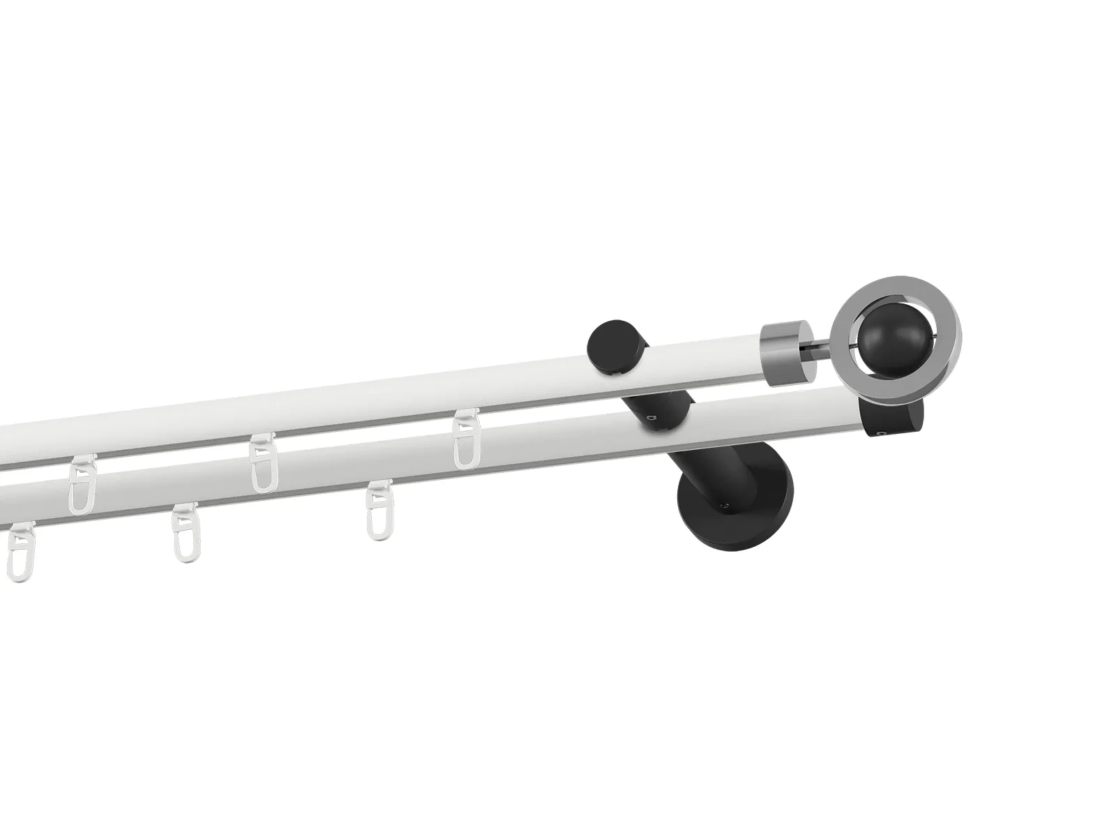 Dvojradová drážková garniža s povrchovou úpravou - bielo čierna lakovaná. Garniže sú dodávané sú v kompletoch. Tvar koncovky a typ držiaka podľa zadaného výberu.