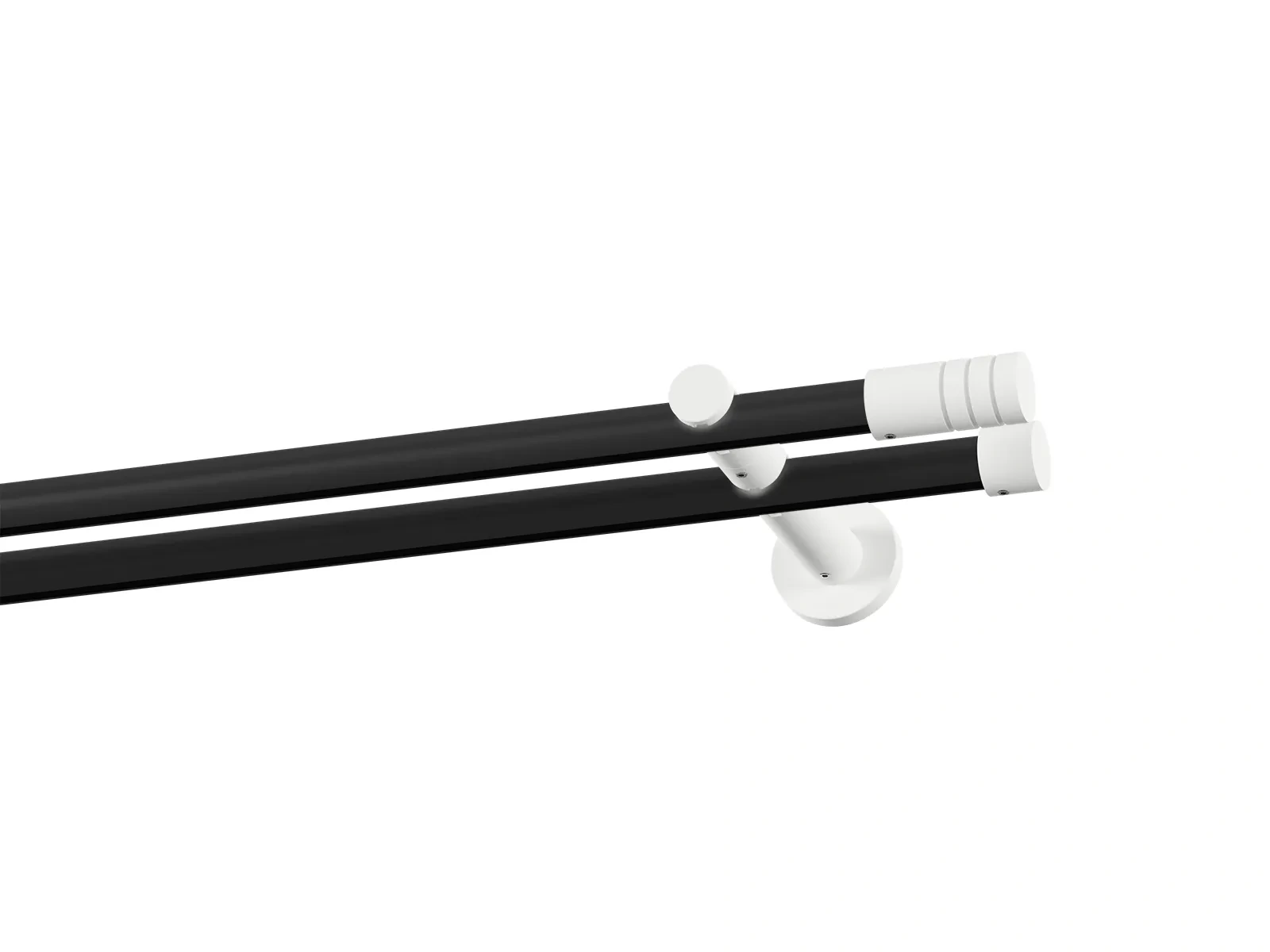 Dvojradová drážková garniža s povrchovou úpravou - čierno biela lakovaná. Garniže sú dodávané sú v kompletoch. Tvar koncovky a typ držiaka podľa zadaného výberu.