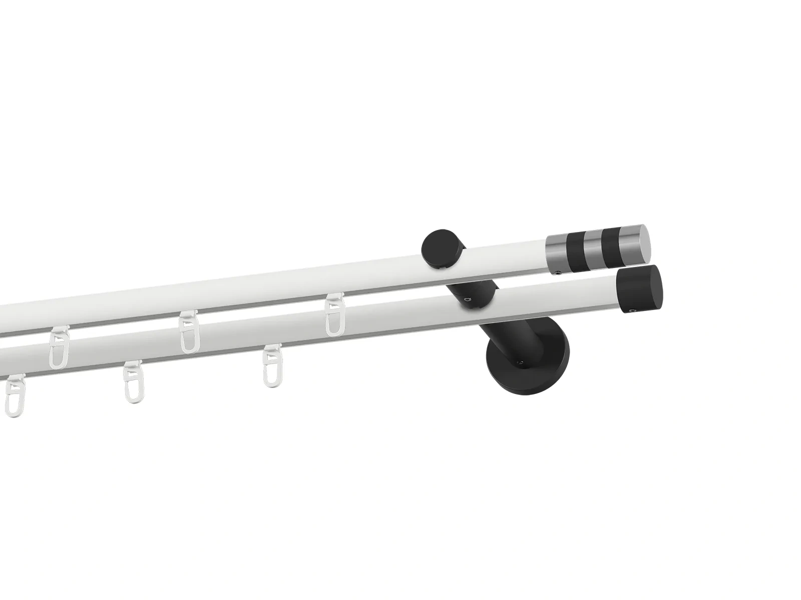 Dvojradová drážková garniža s povrchovou úpravou - bielo čierna lakovaná. Garniže sú dodávané sú v kompletoch. Tvar koncovky a typ držiaka podľa zadaného výberu.
