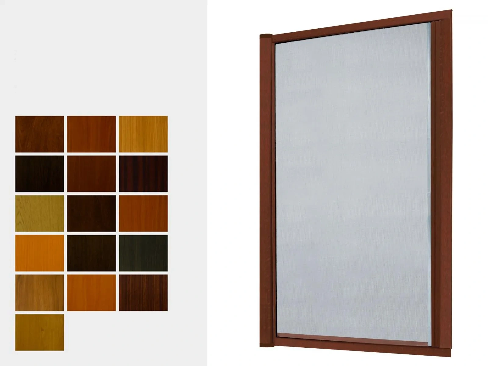 Sieťky proti hmyzu v úprave renolit sú vyrábané z hliníkového profilu, ktoré sú potiahnuté drevoimitačnou fóliou, ktorá sa používa aj pri výrobe plastových okien v drevoimitačnej úprave. Použité názvy sú originálne názvy fólií RENOLIT. Zobrazené farby sú závislé od nastavenia vášho zobrazovacieho zariadenia a môžu líšiť od skutočnosti.