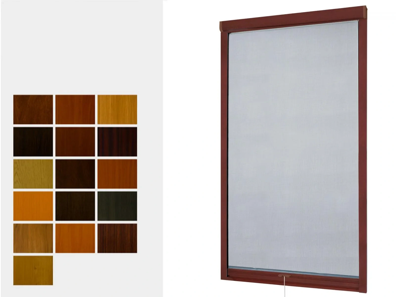 Sieťky proti hmyzu v úprave renolit sú vyrábané z hliníkového profilu, ktoré sú potiahnuté drevoimitačnou fóliou, ktorá sa používa aj pri výrobe plastových okien v drevoimitačnej úprave. Použité názvy sú originálne názvy fólií RENOLIT. Zobrazené farby sú závislé od nastavenia vášho zobrazovacieho zariadenia a môžu líšiť od skutočnosti.
